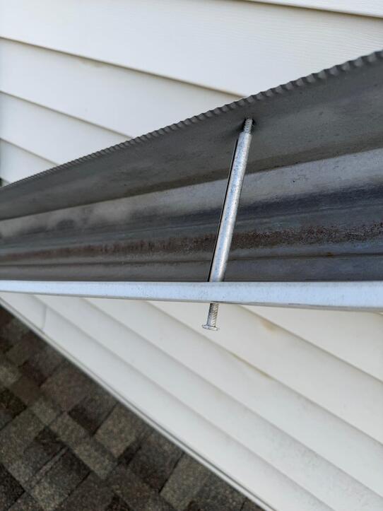 If you have the original gutters on a home built before the mid 2000's, chances are it was installed with a method called "nail and ferrule". In simple terms, these gutter systems use a large nail and a metal tube (called a ferrule) to hold the gutter in place. The easiest way to identify if you home has nail and ferrule gutters is the visible nail head on the top edge of the gutter (looks like a small coin every 2 feet or so on a gutter). See picture below for an example: